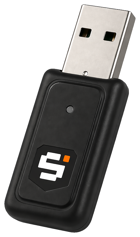 - Small USB dongle — plugs into your existing PC, no new hardware